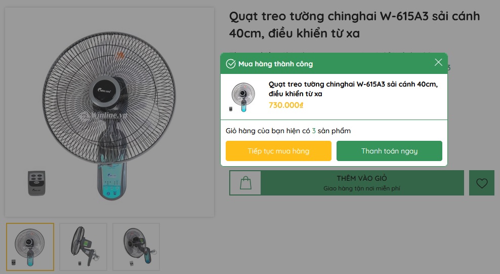 Bước 2: Click và sản phẩm muốn mua, màn hình hiển thị ra pop up với các lựa chọn sau: