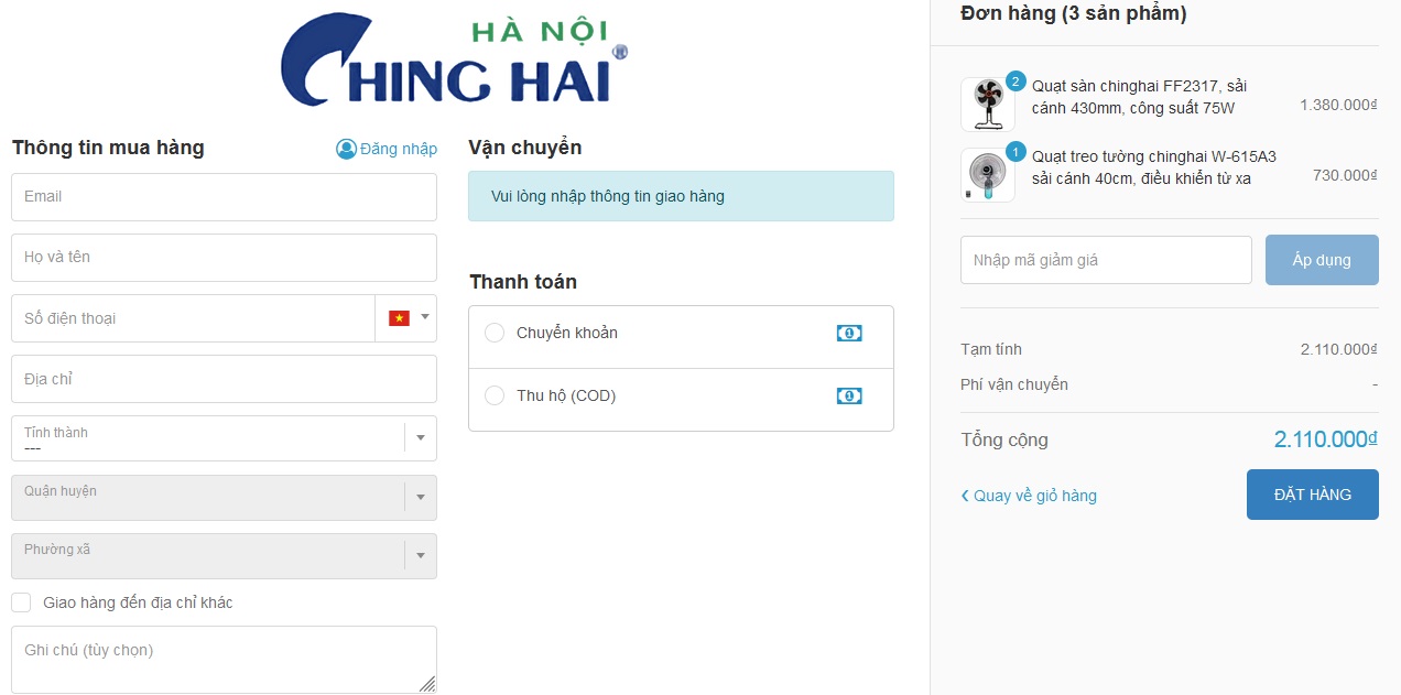 Bước 4: Điền các thông tin của bạn để nhận đơn hàng, lựa chọn hình thức thanh toán và vận chuyển cho đơn hàng của mình